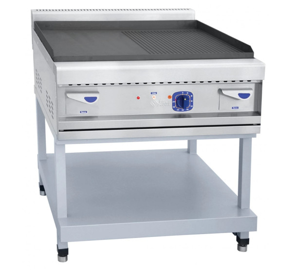 Габариты: 844х900х950 мм, 12000Вт, 380В, + 30...+ 270 С, 1/2 гладкая,1/2 рифленая-стальная поверхность, размеры конфорки: 834х703 мм, 900 серия, крашеная подставка с полкой.