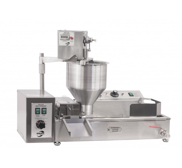 790х550х600мм, Аппарат пончиковый автоматический, настольный, с 1 ванной 8л, из нержавеющей стали, Производительность 200шт/ч дрожжевых или 240шт/час смесевых пончиков, вес пончика 35-55г, плунжерная пара D36 в комплекте.